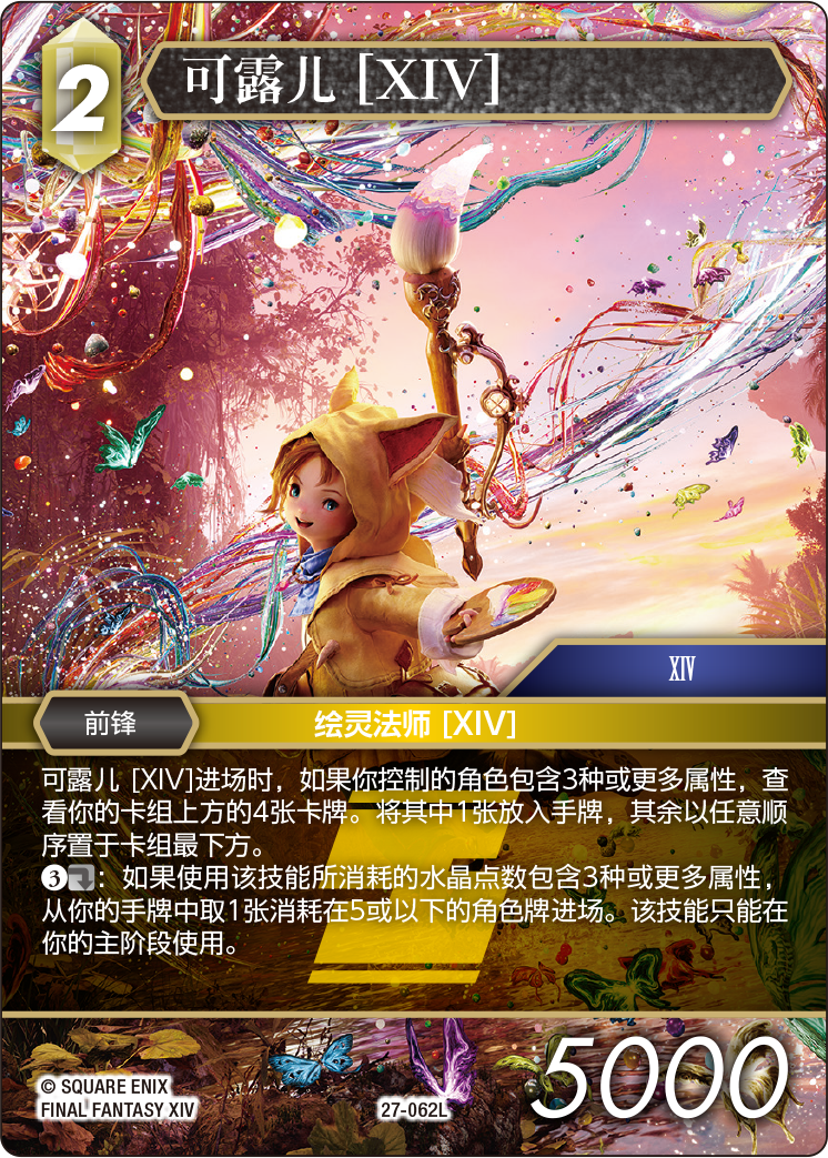 虽然可露儿在《晓月之终途》为止几乎没有参与过战斗,不过在《金曦之遗辉》中,她作为新职业绘灵法师走上了战斗的前线。《FFTCG》过往的2张【6-071H】可露儿 [XIV]和【23-085R】可露儿 [XIV]都是后卫,这次她以前锋的身份登场了!这就来看看卡牌的性能如何吧。