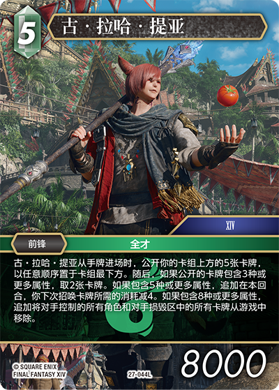 误: 古•拉哈•提亚从手牌进场时,公开你的卡组上方的5张卡牌,以任意顺序置于卡组最下方。随后,如果公开的卡牌包含3种或更多属性,取2张卡牌。如果包含5种或更多属性,追加在本回合,你下次招唤卡牌所需的消耗减4。如果包含8种,追加将对手控制的所有角色和对手损毁区中的所有卡牌从游戏中移除。